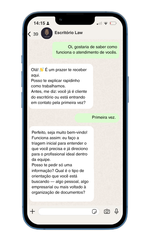 Organize todas as conversas em um só lugar, coordene múltiplos atendentes e eleve o nível de profissionalismo do seu escritório. Transforme cada contato em oportunidade com atendimento automático inteligente e fluido. E opere com total tranquilidade: a API Oficial do WhatsApp garante estabilidade, segurança e zero risco de bloqueios.
